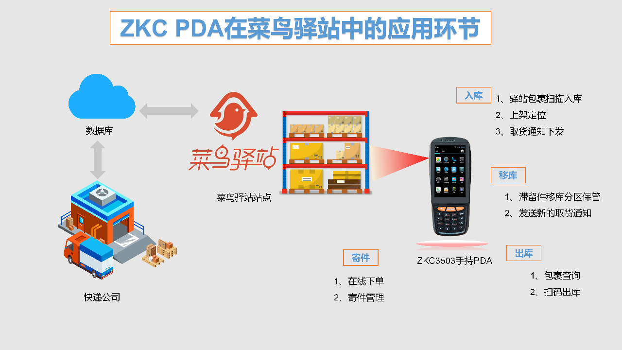 基于智能手持PDA的包裹信息化管理方案。通過專業(yè)的ZKC智能手持終端,實現(xiàn)包裹管理的信息化和智能化。利用條碼掃描技術(shù),高效完成驛站內(nèi)包裹入庫、上架、取貨、短信通知下發(fā)、滯留包裹處理等工作內(nèi)容,全方位精準(zhǔn)監(jiān)管。包裹信息實時采集、傳輸,無縫對接快遞公司后臺。機器分揀減少站點工作量,避免人為分揀出現(xiàn)差錯,有效緩解站點包裹積壓壓力,提高包裹管理效率。