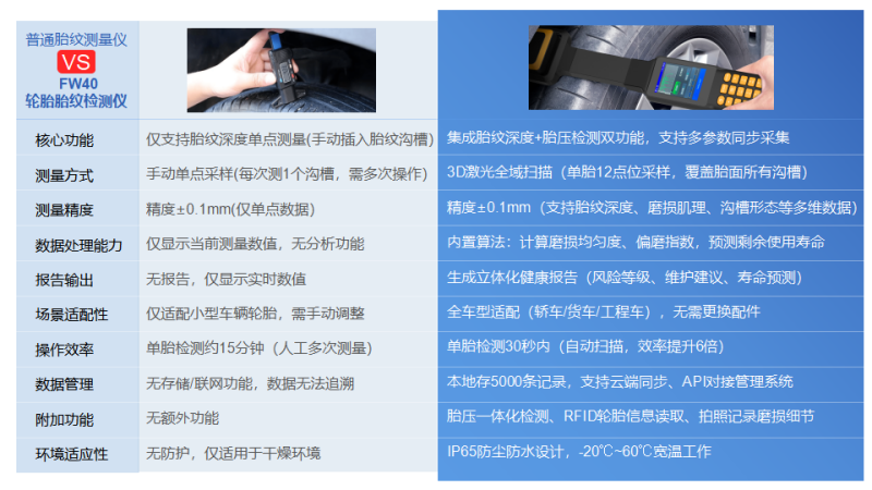 在汽車服務領域,輪胎作為車輛與地面接觸的唯一部件,其健康狀況直接關系到行車安全與運營效益。傳統(tǒng)的手動胎紋測量方式操作繁瑣、數(shù)據(jù)單一,已難以滿足現(xiàn)代車隊管理和專業(yè)服務的需求。今天,我們?yōu)槟榻B一款顛覆性的輪胎檢測工具——FW40輪胎胎紋檢測儀,它以全方位技術創(chuàng)新重新定義輪胎檢測的效率與深度。